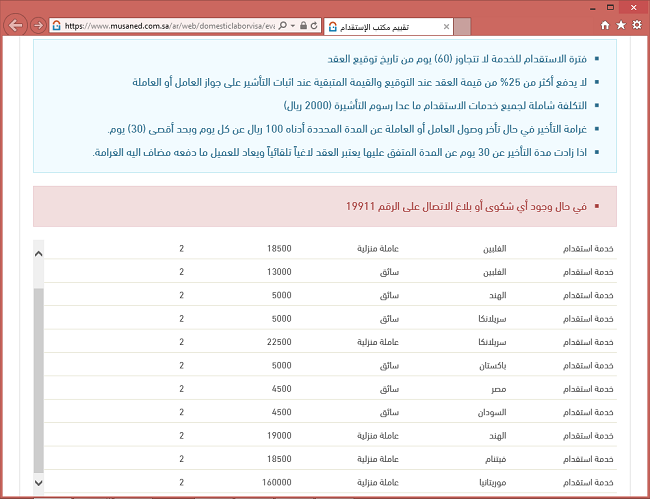سمحت وزارة العمل السعودية منذ أيام بإدراج أحد مكاتب الاستقدام والترخيص له ضمن قائمة موقع "مساند" التابع لها، رغم أن المكتب يعرض ضمن خدماته لاستقدام العمال والعاملات... استقدام نساء من موريتانيا تحت تسمية "عاملة منزلية"؛ لكن الثمن المطلوب لها يقارب 9 أضعاف ثمن الاستقدام من الفلبين، أو ما يعادل ثمن سيارة فخمة. الصورة التالية التقطت اليوم من صفحة المكتب في الموقع: