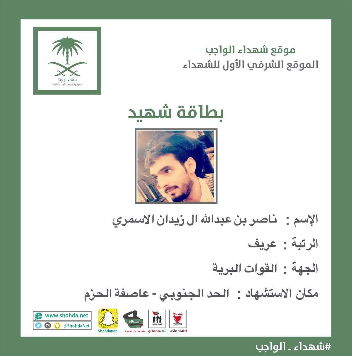 | رقم العضوية : 9523 | | تاريخ التسجيل : 23 - 9 - 2008 | | الجنس : ~ الاهلي | | المشاركات : 155,340 | | الحكمة المفضلة : Canada | | SMS : | | استشهاد العريف ناصر بن عبدالله ال زيدان والعريف أحمد بن محمد حسن طماح تستطيع المشاركة هنا والرد على الموضوع ومشاركة رأيك عبر حسابك في الفيس بوك