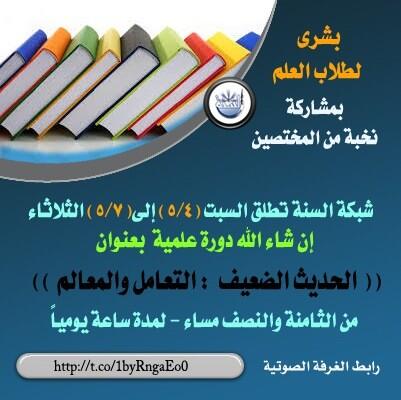 شبكة السنة النبوية تطلق اليوم دورة علمية بعنوان(الحديث الضعيف التعامل والمعالم)3-ايام شبكة السنة النبوية تطلق اليوم دورة علمية بعنوان ( الحديث الضعيف التعامل والمعالم ) https://pbs.twimg.com/media/BFbGaGaCcAAZ3y6.jpg:large تنظم شبكة السنة النبوية وعلومها التابعة للمكتب التعاوني للدعوة وتوعية الجاليات بالربوة يوم السبت القادم 1434/5/4دورة علمية مختصة في الحديث الضعيف ( الحديث الضعيف : التعامل والمعالم ) وذلك عبر موقع الشبكة على الانترنت ذكر ذلك المشرف العام على شبكة السنة النبوية وعلومها الاستاذ الدكتور فالح بن محمد الصغير وبين أن الدورة مدتها ثلاثة أيام وتهدف الى تعريف الحديث الضعيف لطلبة العلم من خلال تحديد مفهومه وأقسامه وتقديم أمثلة عليه وحكم روايته والعمل به ومضان الحديث الضعيف وضوابط تقويته وأثره على ثقافة المسلم الدينية ، مشيرا الى ان الدورة تأتي نظرا للانتشار الكبير الملاحظ للأحاديث الضعيفة في المجتمع خاصة مع تناقلها باستخدام وسائل الاتصال الحديثة مما يحتم تنبيه المجتمع وتوعيته بخطورة تناقلها عليه دينيا وأخلاقيا . وبين الصغير أن الدورة مفتوحة للمشاركة فيها والاستماع إليها من خلال غرفة صوتية عبر موقع الشبكة على الانترنت من خلال الرابط التالي http://r40612271.s.zyzom.com/وكذلك من خلال بثها على إذاعة الشبكة على الانترنت حيث يتم التواصل بين الملقي والحضور مع إمكانية استقبال الاسئلة عبر البريد الالكتروني أو مباشرة على الموقع مضيف ان الدورة ستقام بعد صلاة العشاء الساعة الثامنة والنصف ولمدة ساعة سيحاضر فيها نخبة من المختصين في علوم الحديث وهم الشيخ سليمان الحرش والشيخ عبدالعزيز العقيل والدكتور ياسر شحاته والشيخ عبدالرحمن القرني ويمكن متابعتها والاستماع اليها مباشرة عبر موقع الشبكة على الانترنت http://www.alssunnah.com |