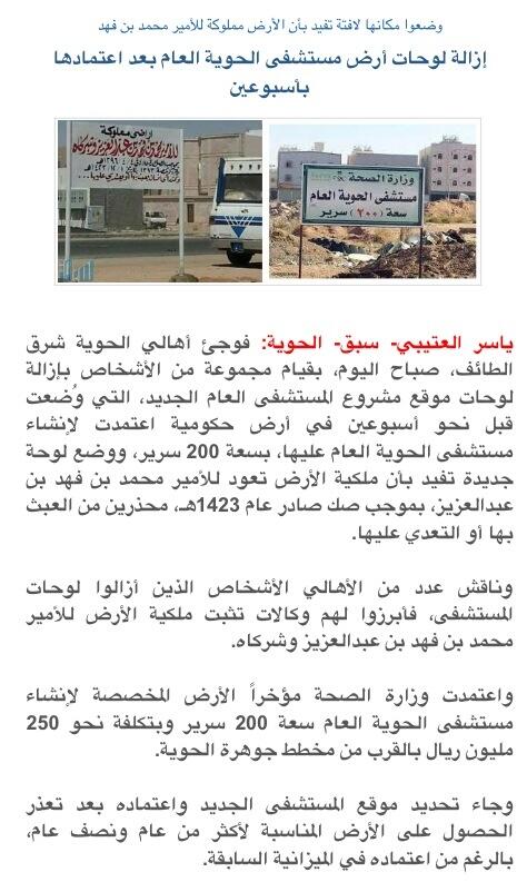 حتى ارض المستشفى تم تشبيكها إزالة لوحات أرض مستشفى الحوية العام بعد اعتمادها بأسبوعين الحوية: فوجئ أهالي الحوية شرق الطائف، صباح اليوم، بقيام مجموعة من الأشخاص بإزالة لوحات موقع مشروع المستشفى العام الجديد، التي وُضعت قبل نحو أسبوعين في أرض حكومية اعتمدت لإنشاء مستشفى الحوية العام عليها، بسعة 200 سرير، ووضع لوحة جديدة تفيد بأن ملكية الأرض تعود للأمير محمد بن فهد بن عبدالعزيز، بموجب صك صادر عام 1423هـ، محذرين من العبث بها أو التعدي عليها. وناقش عدد من الأهالي الأشخاص الذين أزالوا لوحات المستشفى، فأبرزوا لهم وكالات تثبت ملكية الأرض للأمير محمد بن فهد بن عبدالعزيز وشركاه. واعتمدت وزارة الصحة مؤخراً الأرض المخصصة لإنشاء مستشفى الحوية العام سعة 200 سرير وبتكلفة نحو 250 مليون ريال بالقرب من مخطط جوهرة الحوية. وجاء تحديد موقع المستشفى الجديد واعتماده بعد تعذر الحصول على الأرض المناسبة لأكثر من عام ونصف عام، بالرغم من اعتماده في الميزانية السابقة.http://alfaris.net/up/87/alfaris_net_1366569118.jpg https://pbs.twimg.com/media/BIZTeKlCcAEtzw6.jpg:large الموضوع كما هو ظاهر في صحيفة سبق |