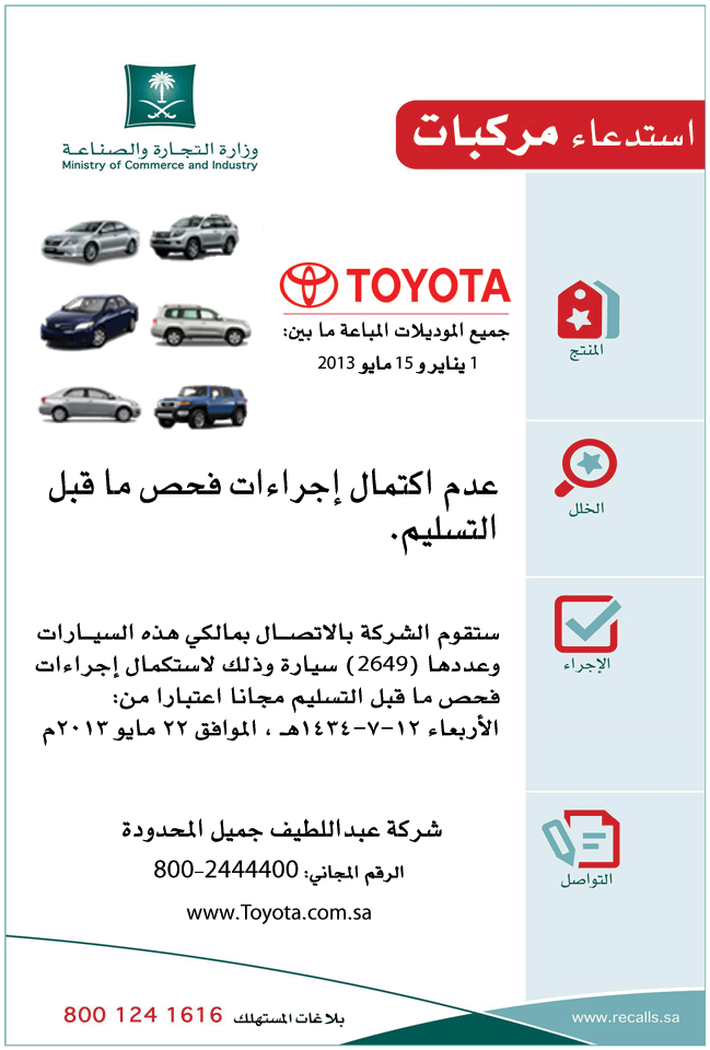 عاجل وزارة التجارة تعلن استدعاء سيارات "تويوتا" ... وزارة التجارة تعلن استدعاء سيارات "تويوتا" المباعة ما بين يناير ومايو 2013م لعدم اكتمال اجراءات الفحص ماقبل التسليم https://pbs.twimg.com/media/BKy3igmCMAIGh41.png:large http://recalls.sa/RecallDetails.aspx?RecallID=42 |