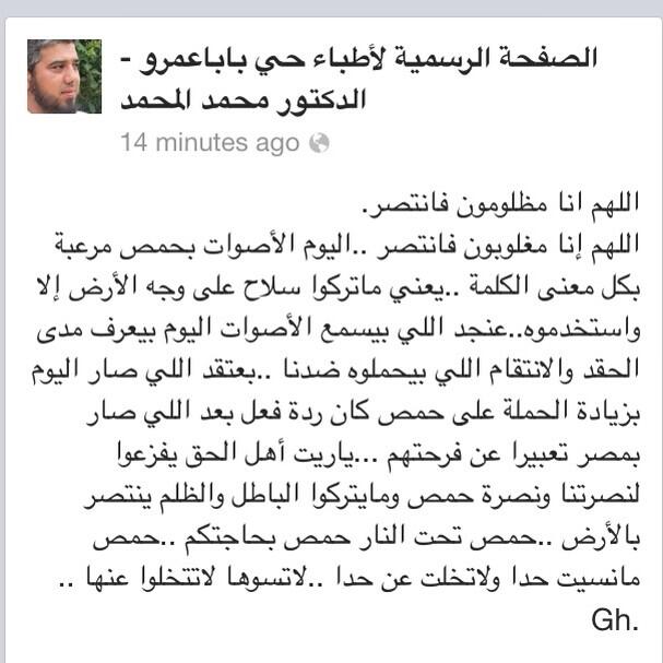 استخدام كيماوي على حي الخالدية واقتراب المجوس من السيطرة على قبر خالد بن الوليد حالات اختناق بين اهل حي الخالدية المحاصرة في حمص احد المدنيين بعد اخراجه من تحت الانقاض في الرستن في حمص يبحث عن اهله لاحول ولا قوة الا بالله |