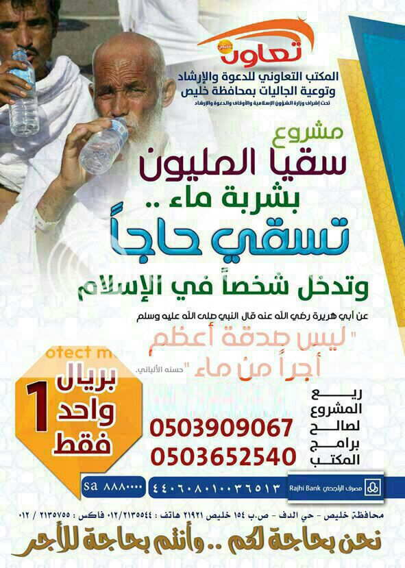 سقيا المليون سقيا الحجاج في أفضل البقاع ( صورة ) بسم الله الرحمن الرحيم قال نبينا صلى الله عليه وسلم ( داوو مرضاكم بالصدقة ) عن انس رضي الله عنه قال قال سعد يارسول الله أن أم سعد كانت تحب الصدقة أفينفعها أن اتصدق عنها ( قال نعم وعليك بالماء ) قال بعض التابعين ( من كثرت ذنوبه فعليه بالماء ) أطلق مكتب جاليات خليص مشروعه الرائع الذي يهدف الى سقيا مليون ضيف من ضيوف الرحمن أكرم وفادة ضيوف الرحمن رجاء أن يكرمك الرحمن حين تفد عليه http://i814.photobucket.com/albums/z...7.jpg~original قال بعض التابعين ( من كثرت ذنوبه فعليه بالماء ) فأين من يريد مسح وتكفير خطاياه بإذن الله فهذه هي الفرصة وهذا هو الباب بتوفيق الله فاين المشمرون واين من يحسن إقتناص الفرص فليكن لك سهم معهم ولو بالقليل للاتصال والأستفسار / 0503909067 0503652540 للتبرع في حساب الراجحي ( حساب رسمي باسم المكتب وسيخرج لك اسم المكتب عن طريق الصراف ) 440608010036513 وللتبرع من اي بنك آخر هذا هو ( الايبان ) SA8880000440608010036513 ساعدونا في نشر الموضوع في المنتديات والإيميلات والقروبات فهي غنيمة باردة فالدال على الخير كفاعلة |