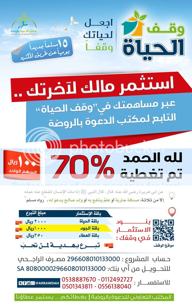 >>>>>>>>> هل نزل الراتب تعال >>>>>>>>>>>>> وشاهد هذه الصور بسم الله الرحمن الرحيم السلام عليكم ورحمة الله وبركاته الحمد لله رب العالمين والصلاة والسلام على رسول الله نبينا محمد وعلى آله وصحبه أجمعين من فضلكــ لآ تدع الشيطان يمنعك .. ردد .. معــي .. أفضل مايمكن أن تساهم فيه وتدخر لنفسك ولوالديك عند الله يوم لاينفع مال ولابنونhttp://files2.fatakat.com/2010/12/12934633481594.gif أن تساهم ولو بسهم واحد في أوقاف خدمت الإسلام والمسلمين أوقاف خدمت الفقير والمسكين وحافظ القرآن واليتيم والداعية ومعلم كتاب الله ومتعلمه والقائم عليه ونشرت الاسلام فلم تعد الاوقاف حكراً على الأغنياء فالفقراء كذلك يمكنهم بناء أوقاف والمشاركة فيها إليكم هذه الأوقاف التي سيستفيد منها آلاف المسلمين بإذن الله فلا تبخل على نفسك بالمساهمة فيها عنك وعن والديك ومن تحب ============ أهم وقف في العالم ============ فرصة العمر للمشاركة في أهم وقف في العالم http://i814.photobucket.com/albums/z...jpg%7Eoriginal وقف موقع دار الإسلام islamhouse ( إسلام هاوس ) الوقف يقوم بالتمويل والصرف على موقع دار الإسلام www.islamhouse.com أضخم موقع إسلامي في العالم ب ( ظ،ظ ظ¦ ) لغة ويزوره شهريا حوالي مليون زائر وقد حصد الموقع كثير من الجوائز المحليه والعالمية ويعتبر أكبر مرجعية في العالم للتعريف بالإسلام بلغات العالم على شبكة الإنترنت وهذا الوقف يقوم بتأمين تكاليف السيرفرات ورواتب الدعاة ورفع الكتب وكل شيئ يحتاجه الموقع السهم ب ظ،ظ£ظ¤ ريالاً توقف ملفاً دعوياً على الإنترنت يدوم بإذن الله طول العمر وبعد الممات. التبرع مفتوح بأي مبلغ تستطيعه الموقع والوقف كما هو معروف تابع للمكتب التعاوني للدعوة وتوعية الجاليات بالربوة http://i814.photobucket.com/albums/z...jpg%7Eoriginal للإتصال والإستفسار / 0569377432 0569376738 0569374986 للتواصل واتساب : 0569374986 للتبرع المباشر في حساب الوقف في مصرف الراجحي (حساب رسمي وسيخرج لك أسم الجاليات على شاشة الصراف) 296608010177270 للتبرع من أي بنك آخر ( رقم الآيبان ) SA2480000296608010177270 ============ وقف الحياة ============ أجمل وأروع هدية تهديها لوالديك مكتوب عليها اسمهم لتكسب رضاهم وبرهم وهذا نموذج للشهادة أو الدرع المطبوع عليها اسم الوالدين أو من تحب http://i814.photobucket.com/albums/z...jpg%7Eoriginal المشروع برعاية المكتب التعاوني للدعوة والإرشاد وتوعية الجاليات بالروضة وهذه صفحة المشروع في موقع المكتب الرسمي http://www.arrawdah.com/dimofinf/pag...ction=waqflife فكرة المشروع : ان تقوم بالتبرع بسهم في وقف الحياة ويعطونك وثيقة أو درع مطبوع عليه اسم والديك لتهديهم اياها وتكسب رضاهم وبرهم ودعائهم أو يكون بأسم من تحب لايشترط الوالدين فقط بل تستطيع ان تهدي السهم الى كل من تحب وتضع اسمه على الشهادة أو الدرع وتهديه اياها http://i814.photobucket.com/albums/z...jpg%7Eoriginal للمساهمة في المشروع هناك 3 اسهم سهم ب 2000 ريال سهم ب 1000 ريال سهم ب 250 ريال http://i814.photobucket.com/albums/z...jpg%7Eoriginal للإتصال والإستفسار / 0538887670 0556138040 0501343811 0112492727 للتبرع في الحساب الخاص بالوقف في بنك الراجحي (حساب رسمي بأسم مكتب جاليات الروضة وسيخرج لك أسم المكتب على شاشة الصراف) 296608010133000 وللتحويل من أي بنك آخر ( رقم الآيبان ) 8080000296608010133000 SA وهذه صفحة المشروع في موقع المكتب الرسمي http://www.arrawdah.com/dimofinf/pag...ction=waqflife عند التحويل لأحد حسابات البنوك الأخرى غير الراجحي ارسل لهم رسالة ============ وقف الدعوة النسائي ============ تابع للمكتب التعاوني للدعوة و الإرشاد وتوعية الجاليات بعنيزة. قيمة السهم 50 ريال وبالإمكان التبرع باي عدد من الأسهم من خلال هذا الوقف ستساهم بإذن الله في :- - إقامة 150 درس ومحاضرة شهريا . - دخول ما يقارب 20 مسلمة جديدة في الإسلام شهريا. - حضور ما يقارب من 300 امرأة و فتاة شهريا لمناشط المكتب الدعوية . - توزيع الكتب والمصاحف على الحاضرات من المسلمات وغير المسلمات . http://i769.photobucket.com/albums/x...jpg%7Eoriginal للاتصال والاستفسار : جوال / 0553643030 جوال /0553634040 للتبرع في بنك الراجحي (حساب رسمي بأسم مكتب جاليات عنيزة وسيخرج لك أسم المكتب على شاشة الصراف) 565608010002050 للتبرع في بنك البلاد (حسا
