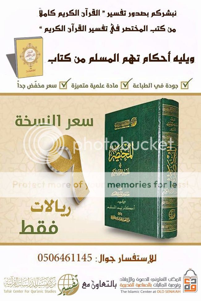 فرصة العمر>>> بسعر لايصدق فأين من يحسن >>> إقتناص الفرص ( صورة ) بسم الله الرحمن الرحيم السلام عليكم ورحمة الله وبركاته الحمد لله والصلاة والسلام على رسول الله نبينا محمد وعلى آله وصحبه أجمعين من فضلكــ لآ تدع الشيطان يمنعك ..ردد .. معــي .. سُبْحانَ اللهِ وَالْحَمْدُ للهِ وَلا اِلـهَ اِلاَّ اللهُ وَاللهُ اَكْبَرُ http://files.fatakat.com/2010/3/1267850822.gif نبشركم بصدور تفسير القرآن الكريم كاملاً المختصر في تفسير القرآن الكريم ويليه أحكام تهم المسلم من كتاب تفسير العشر الأخير كل هذا ب 9 ريالات فقط http://i814.photobucket.com/albums/z...jpg%7Eoriginal جودة عالية جدا في الطباعة مادة علمية متميزة سعر منخفض جداً بإمكانك ان تطلبه وتستلمه أو تتبرع بقيمته وهم يقومون بتوزيعه عنك ولك أجره المكتب التعاوني للدعوة والإرشاد وتوعية الجاليات بالصناعية القديمة للإتصال والإستفسار/ 0506461145 للإتصال من خارج السعودية : 00966506461145 نرجوا أن تساعدونا في نشر الموضوع فكم من مسلم سيتلوا القرآن آناء الليل والنهار ويتعلم دينه ولك مثل أجره فلا تحرم نفسك الخير لاتنسونا من الدعاء http://files2.fatakat.com/2011/5/13052005721594.gif |