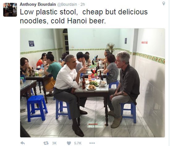 تداول مستخدمو موقع التواصل الاجتماعى فيسبوك صوراً للرئيس الأمريكى باراك أوباما فى أحد المطاعم الشعبية بهانوى فيتنام، يتناول العشاء مع الكاتب الصحفي أنتوني بوردين.