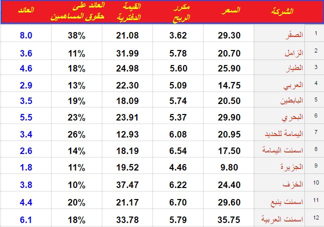 الشركات التي يقل مكرر ربحيتها عن7 الشركات التي يقل مكرر ربحيتها عن 7 بأغلاق الاثنين3-10-2016 https://pbs.twimg.com/media/Ct3XRzVXEAAnPDR.jpg:large |