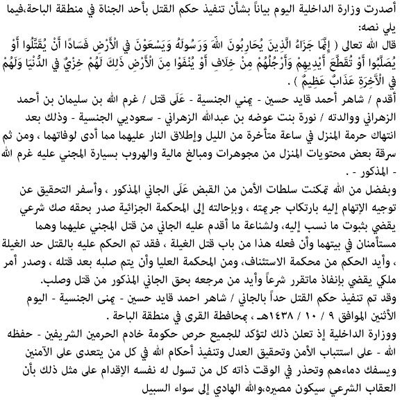 | لميسـ | 07-03-2017 02:10 PM | تنفذ حد القصاص بحق يمني قتل مواطن ووالدته |