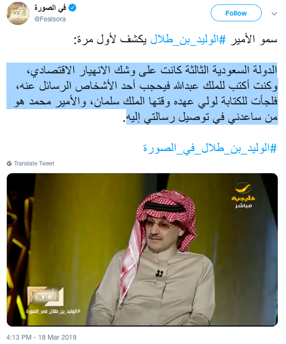 الوليد بن طلال: المملكة كانت على وشك انهيار اقتصادي وشخص كان يمنعني عن المل الوليد بن طلال: المملكة كانت على وشك انهيار اقتصادي وشخص كان يمنعني عن الملك عبدالله https://pbs.twimg.com/media/D1-Uh8tXcAEQDM1.png:largeالمقطع هنا https://twitter.com/Fealsora/status/1107736701538062339 |