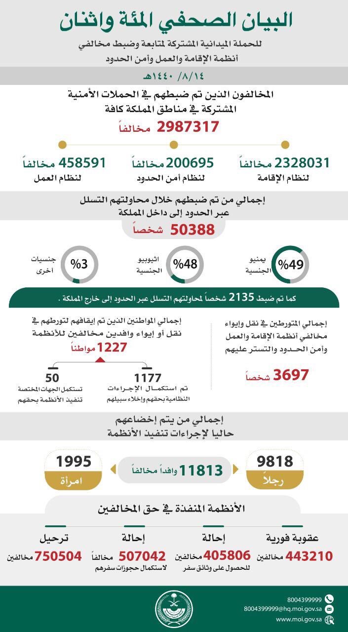 الداخلية لمره الثانيه تعلن : القبض على ثلاث مليون مخالف #وزارة_الداخلية تعلن ضبط 2،987،317 ثلاثة مليون (الا اثنا عشر الفا) مخالفًا في الحملة الأمنية المشتركة لمتابعة وضبط مخالفي أنظمة الإقامة والعمل وأمن الحدود. #وطن_بلا_مخالف تركيز بالصوره https://pbs.twimg.com/media/D4jaWSaX...jpg&name=large حلم خاثر . |